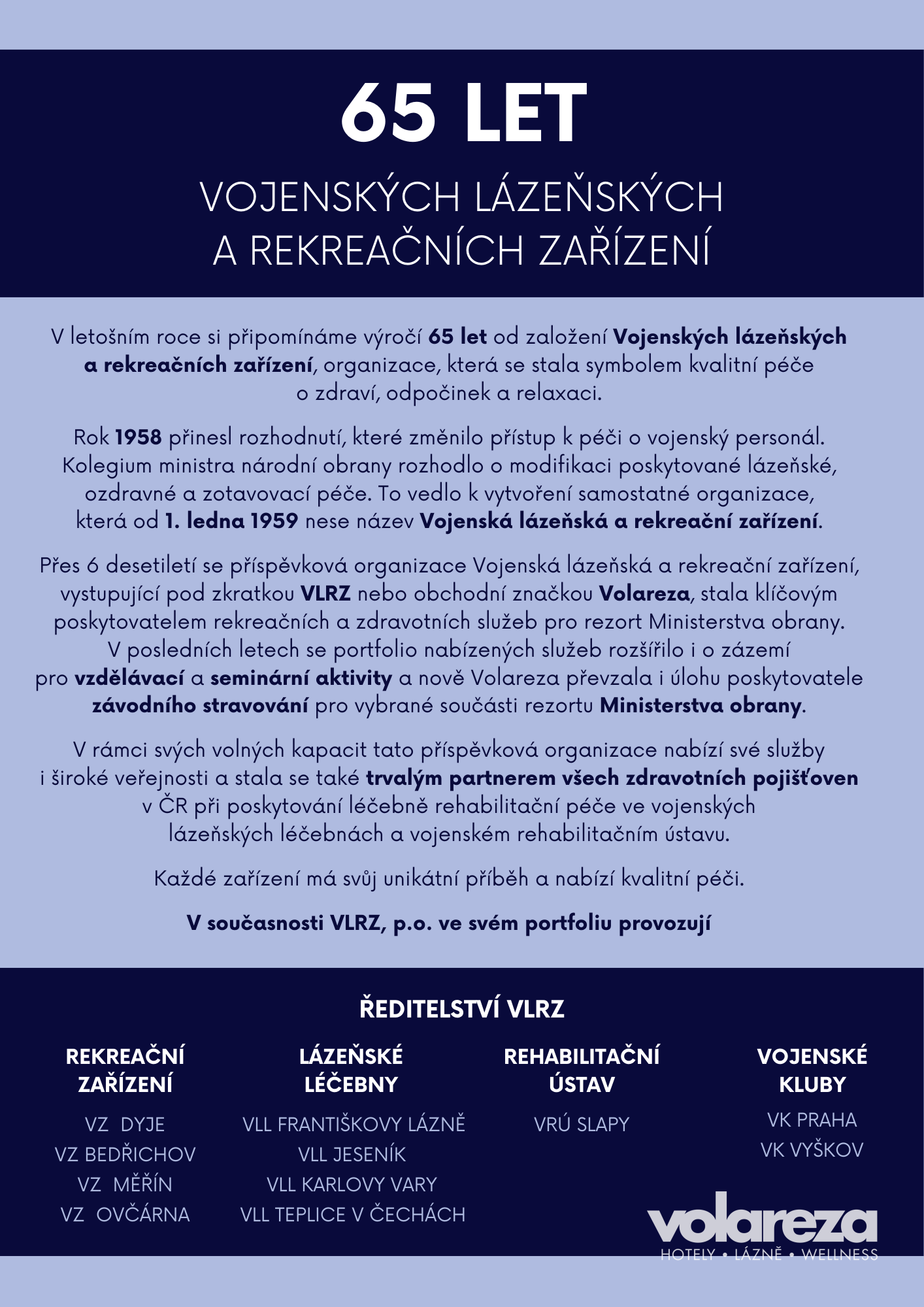 Vojenská lázeňská a rekreační zařízení letos slaví výročí 65 let od založení! Podívejte se, jakými výraznými změnami prošel celkový vývoj služeb.